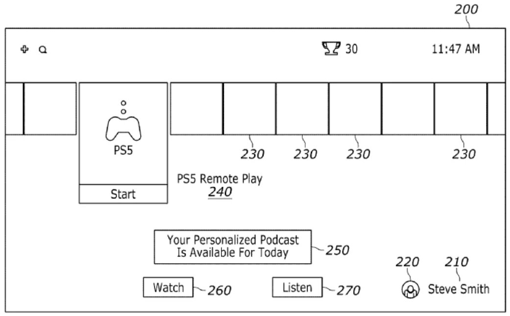 Do wniosku patentowego dołączono grafiki pokazujące, jak takie podcasty mogłyby być prezentowane na pulpicie konsoli PlayStation, także w formie wideo, z wirtualnymi "prowadzącymi" na ekranie.