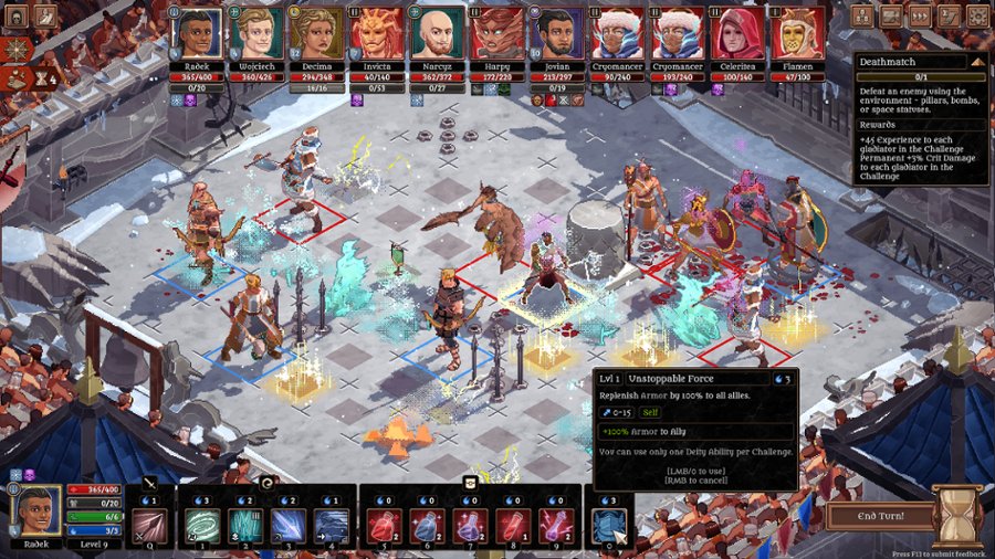 Poprowadź drużynę gladiatorów podczas turowych starć na arenie oraz rekrutuj i szkól, a czasem poświęcaj ich w imię chwały. Pamiętaj jednak, że twoi gladiatorzy to śmiertelnicy – jeśli polegną w boju, utracisz ich na zawsze... choć ich legenda będzie wiecznie żywa. Jako szlachcic i dziedzic będziesz zarządzać miastem, odblokowując,... Poprowadź drużynę gladiatorów podczas turowych starć na arenie oraz rekrutuj i szkól, a czasem poświęcaj ich w imię chwały. Pamiętaj jednak, że twoi gladiatorzy to śmiertelnicy – jeśli polegną w boju, utracisz ich na zawsze... choć ich legenda będzie wiecznie żywa. Jako szlachcic i dziedzic będziesz zarządzać miastem, odblokowując, budując i ulepszając budynki zapewniające nowe usługi i mechaniki, które wesprą cię w twych dążeniach do krwawej zemsty. Wiedziony palącą nienawiścią i pragnieniem sprawiedliwości, masz za sobą zaciekłą walkę o przetrwanie. Teraz, jako wpływowy patron i trener gladiatorów, planujesz swoją zemstę na despotycznym cesarzu, który odebrał ci wolność i zamordował twojego ojca. Droga do odkupienia niesie jednak olbrzymie ryzyko i przyjdzie ci się poruszać w zdradliwym świecie, pełnym podstępu i niebezpieczeństw. Werbuj sojuszników i powiększaj swoją drużynę gladiatorów, aby wspiąć się na szczyty brutalnych turniejów. Każde zwycięstwo przybliża cię do wielkiej stolicy, skrywającego twój ostateczny cel – pogrążonego w obłędzie cesarza, który czeka na swym tronie. czytaj dalej